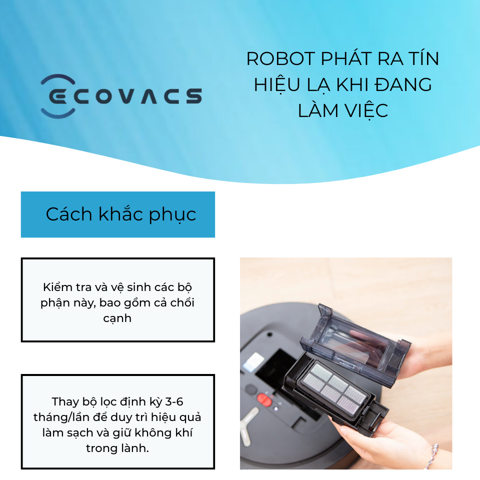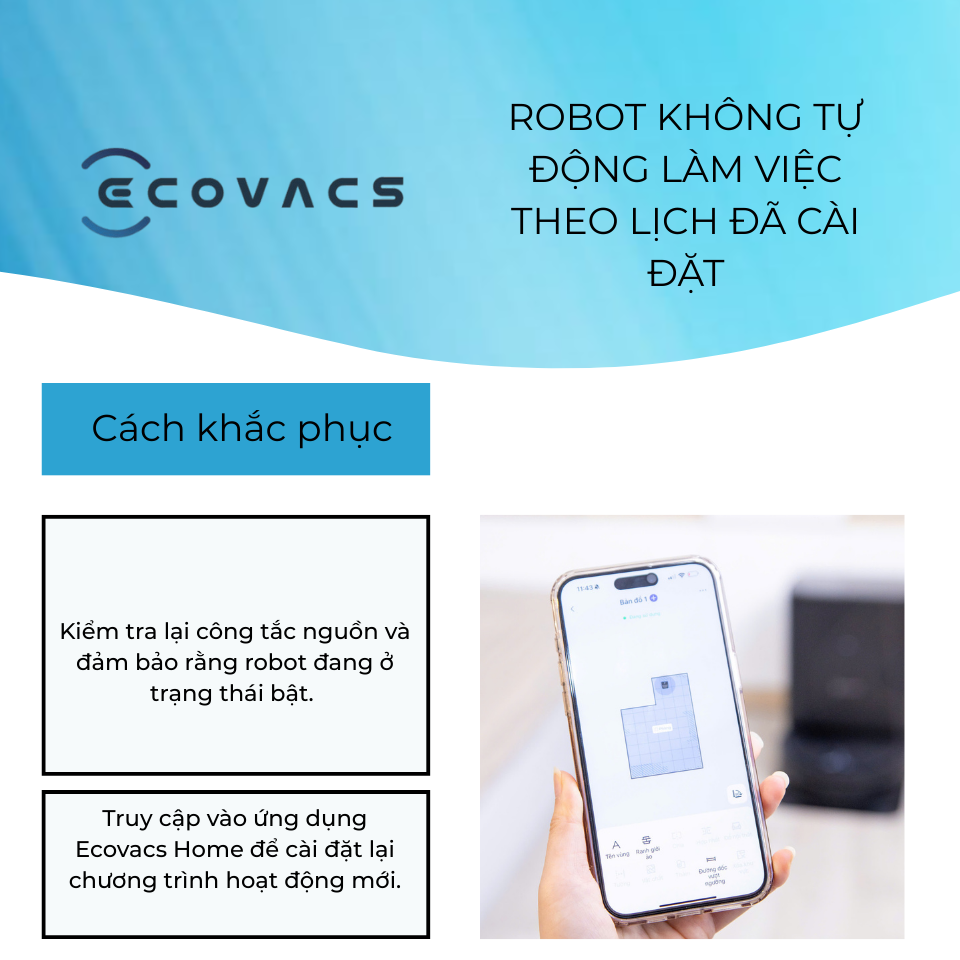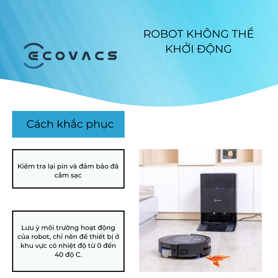 Trong quá trình sử dụng, robot hút bụi Ecovacs có thể gặp một số sự cố khiến thiết bị hoạt động không ổn định. Việc nắm rõ nguyên nhân và cách khắc phục sẽ giúp bạn xử lý nhanh, tiết kiệm thời gian và đảm bảo robot luôn vận hành trơn tru.