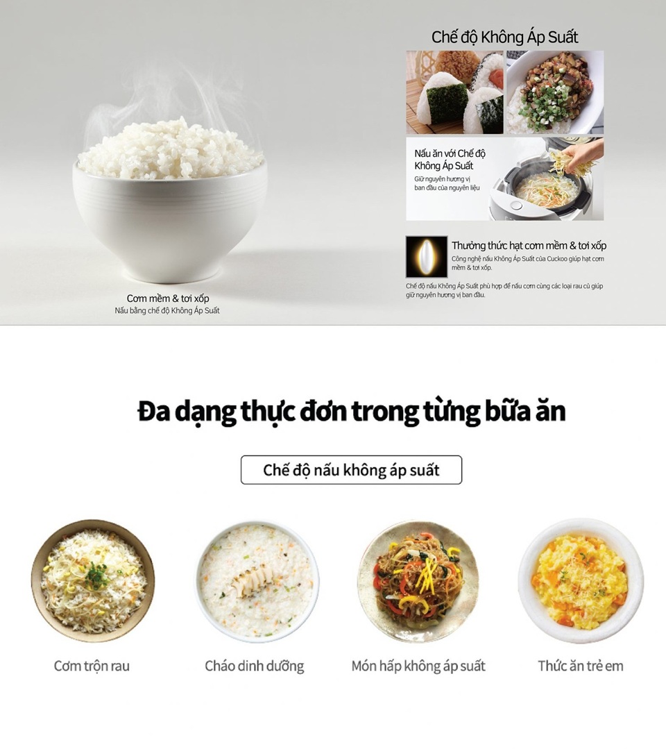 Công nghệ Twin Pressure cho phép chọn giữa nấu áp suất hoặc không áp suất. Khi cần cơm dẻo, mềm, bạn chọn chế độ áp suất. Nếu thích cơm khô, tơi hạt, bạn có thể chuyển sang chế độ không áp suất chỉ với một thao tác. Điều này cũng rất lý tưởng khi nấu cháo, hấp rau củ hoặc chế biến món ăn cho trẻ nhỏ.