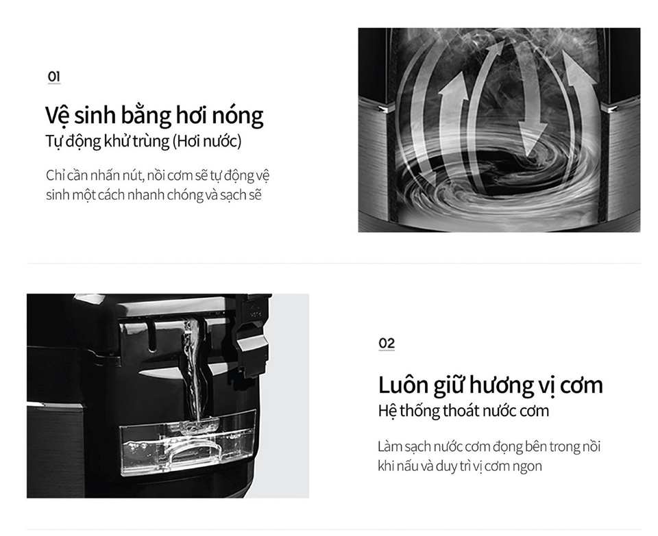 Sau mỗi lần nấu, bạn chỉ cần kích hoạt chế độ Auto Clean. Nồi sẽ tự động xả hơi nước nóng để làm sạch khoang nấu và nắp trong. Nhờ đó, bạn không cần tháo rời các bộ phận để chùi rửa thủ công. Tính năng này giúp duy trì vệ sinh, ngăn vi khuẩn và mùi hôi phát triển.