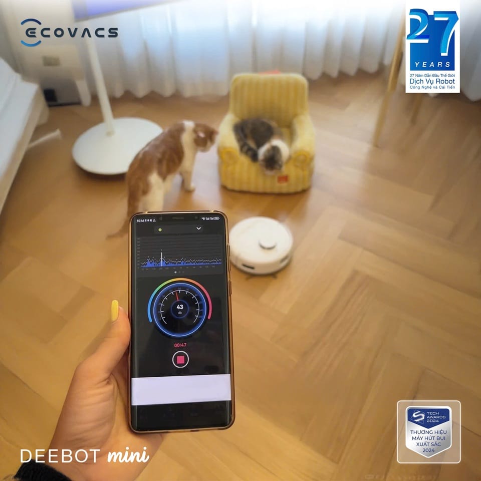 DEEBOT Mini vận hành ở mức ồn chỉ 55 dB khi hút và lau. Ứng dụng ECOVACS HOME cho phép điều khiển robot từ xa, đặt lịch dọn, chọn chế độ và theo dõi trạng thái dễ dàng.