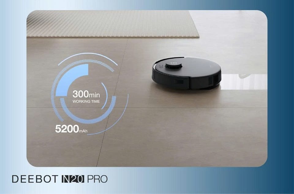 Ecovacs Deebot N20 Pro được trang bị pin dung lượng 5.200mAh. Robot có thể hoạt động liên tục tới 300 phút trong chế độ tiêu chuẩn.