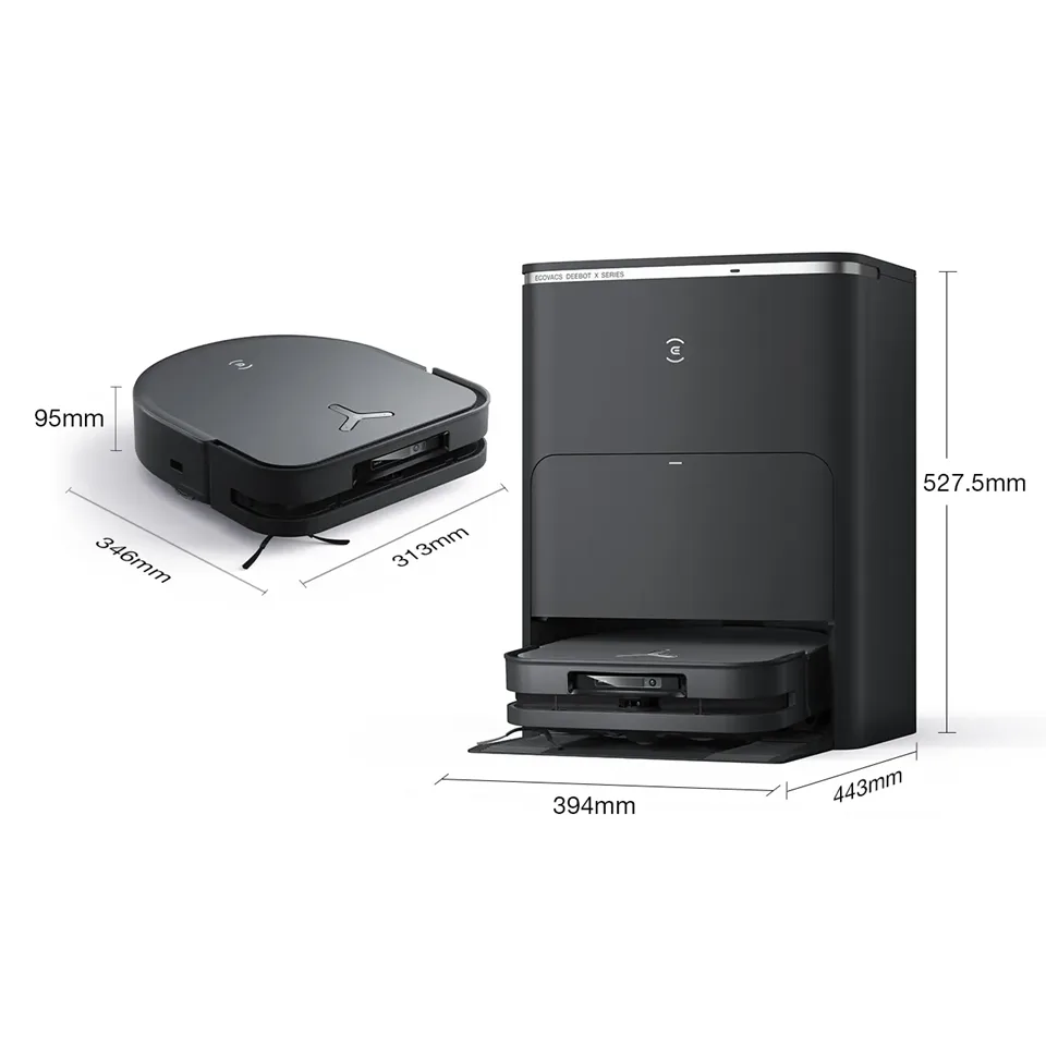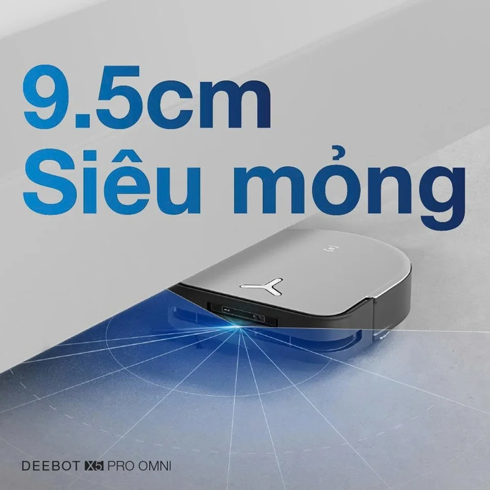 Ecovacs DEEBOT X5 PRO OMNI có thiết kế D-shape hiện đại. Giúp làm sạch sát mép tường và góc hẹp hiệu quả. Thân máy mỏng 9,5 cm, dễ dàng di chuyển dưới gầm giường, ghế sofa và tủ thấp.
