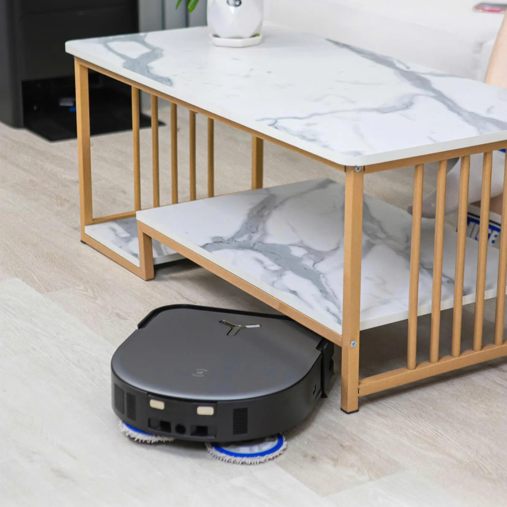 Trên bề mặt gồ ghề hoặc có vật cản thấp, robot duy trì áp lực lau ổn định để loại bỏ bụi bẩn cứng đầu. Khi gặp thảm, mô-đun lau tự nâng 15mm để tránh làm ướt. Nhờ công nghệ này, DEEBOT X5 PRO OMNI mang đến khả năng làm sạch toàn diện. Sàn nhà luôn sáng bóng từ trung tâm cho tới từng góc cạnh.