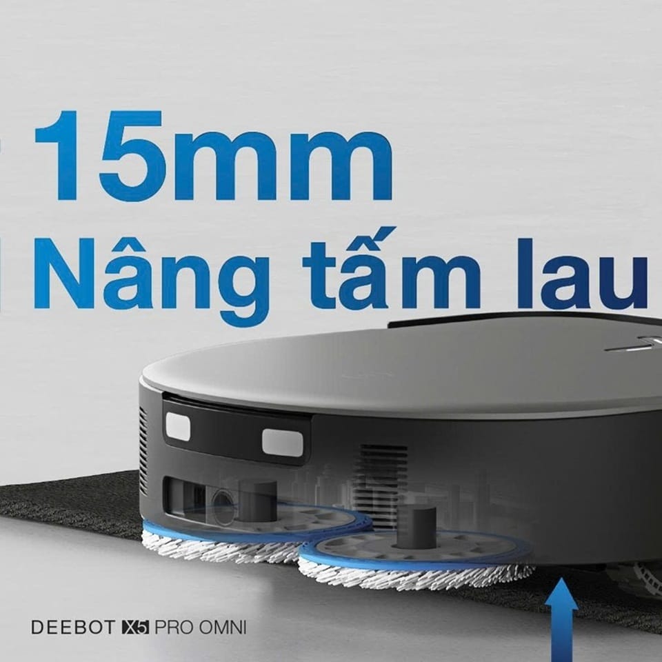 DEEBOT X5 PRO OMNI sở hữu tính năng tự nâng tấm lau khi phát hiện thảm. Cảm biến nhận diện bề mặt nhanh chóng, giúp mô-đun lau nâng lên 15mm để tránh làm ướt.