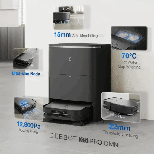 Ecovacs DEEBOT X5 PRO OMNI là robot hút bụi lau nhà thế hệ mới, sở hữu lực hút mạnh mẽ 12.800Pa, lau sát mép chỉ 1mm, và công nghệ chống rối tóc ZeroTangle. Kết hợp với trạm OMNI toàn năng – tự hút bụi, giặt giẻ bằng nước nóng 70°C và sấy khô bằng khí nóng – sản phẩm mang đến trải nghiệm “dọn nhà không cần chạm tay”. Cùng hệ thống AI điều hướng thông minh, DEEBOT X5 PRO OMNI làm sạch sâu, nhanh và chính xác, là lựa chọn hoàn hảo cho gia đình bận rộn muốn giữ nhà luôn sạch bóng.