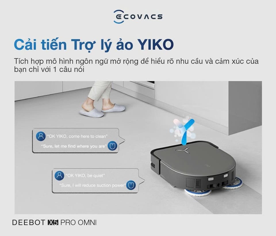 DEEBOT X5 PRO OMNI hỗ trợ điều khiển qua ứng dụng Ecovacs Home, cho phép bạn lên lịch và chọn chế độ làm sạch dễ dàng. Robot cũng tương thích với Apple Watch và trợ lý ảo YIKO, giúp ra lệnh nhanh chóng bằng giọng nói.