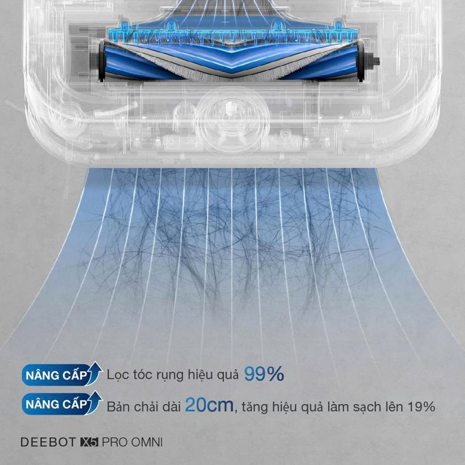 DEEBOT X5 PRO OMNI sử dụng chổi chính ZeroTangle với thiết kế đặc biệt. Giúp giảm tối đa tình trạng tóc và lông thú quấn vào trục. Cấu trúc chổi có các dải gân chéo kết hợp lược kép, gỡ tóc và sợi rác ngay trong quá trình hút.