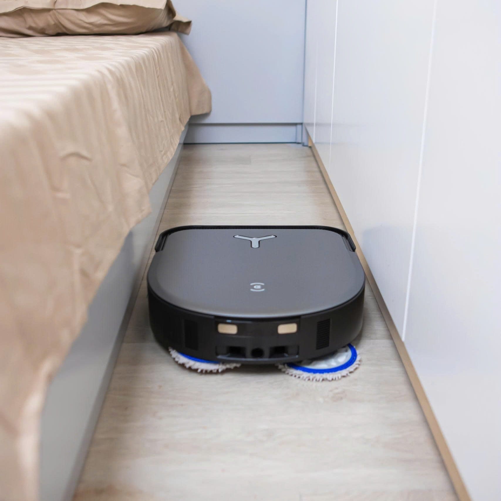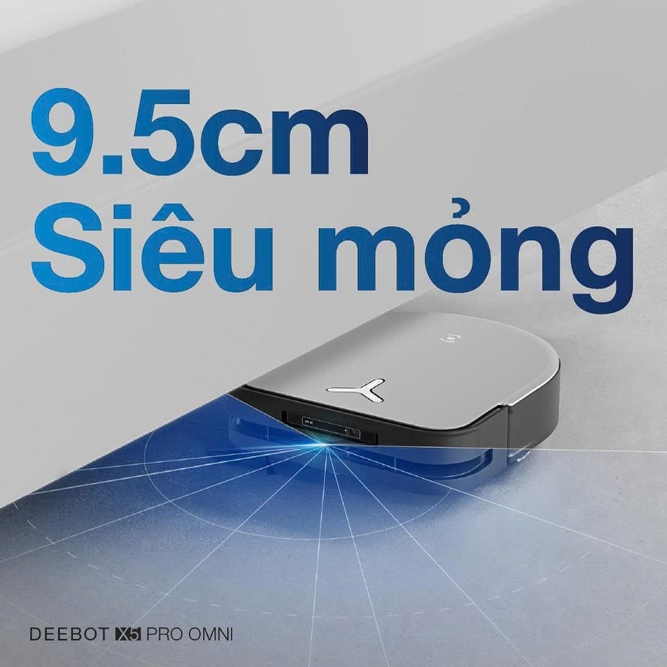 Ecovacs DEEBOT X5 PRO OMNI có thiết kế D-shape hiện đại. Giúp làm sạch sát mép tường và góc hẹp hiệu quả. Thân máy mỏng 9,5 cm, dễ dàng di chuyển dưới gầm giường, ghế sofa và tủ thấp.