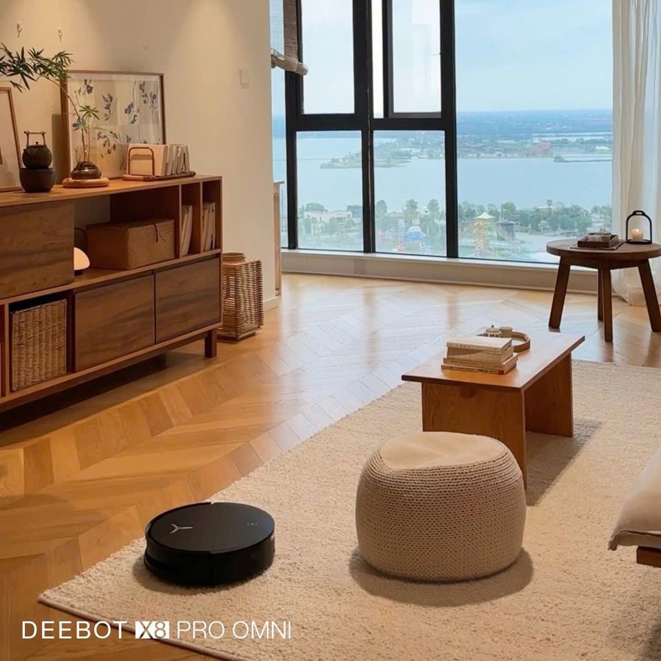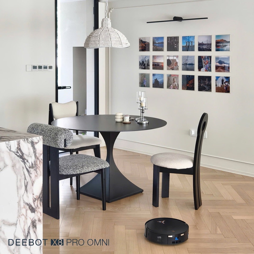 Ecovacs Deebot X8 Pro Omni có thân máy mỏng chỉ 99mm, dễ dàng di chuyển dưới gầm bàn, giường và tủ thấp. Bề mặt phủ hoàn thiện cao cấp, chống bám bụi và hạn chế trầy xước. Cảm biến bố trí gọn gàng, vừa đảm bảo thẩm mỹ vừa nhận diện vật cản chính xác. Dock sạc OMNI đồng bộ thiết kế, gam màu trang nhã, phù hợp nhiều không gian nội thất.