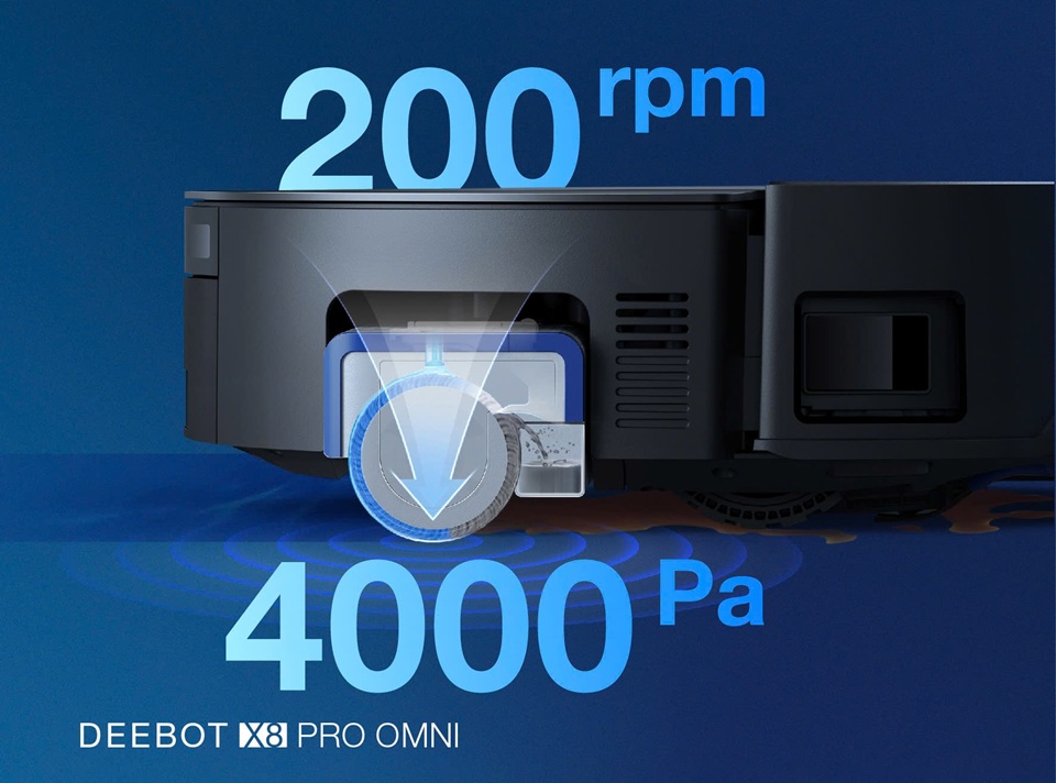 Ecovacs Deebot X8 Pro Omni trang bị hệ thống lau trục xoay OZMO Roller hiện đại. Cây lau xoay tốc độ 200 vòng/phút và áp lực 4.000Pa, giúp chà sạch vết bẩn khô lẫn ẩm bám trên sàn.