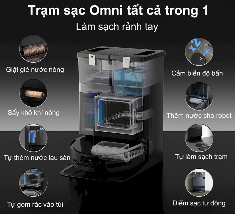 | Trạm OMNI Station | 12-in-1: Đổ bụi, rửa/sấy mop, tiệt trùng nước nóng 75°C, pha dung dịch lau | Đổ bụi, rửa/sấy mop, tiệt trùng nước nóng, tiếp nước tự động | Đổ bụi, rửa/sấy mop, tiếp nước tự động |