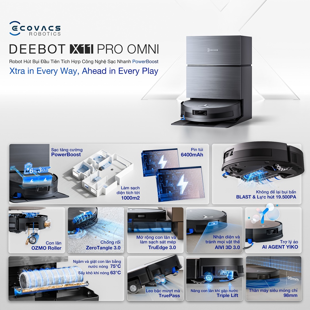 Robot hút bụi lau nhà Ecovacs DEEBOT X11 Pro Omni là một bước đột phá trong công nghệ làm sạch, kết hợp nhiều tính năng thông minh để mang lại hiệu suất vượt trội. Robot này tích hợp công nghệ PowerBoost cho khả năng vận hành liên tục, đi kèm với công nghệ lau OZMO ROLLER 2.0 và TruEdge 3.0 làm sạch sát mép, sâu và rộng hơn. Sức mạnh làm sạch còn được tăng cường bởi hệ thống hút bụi BLAST, giúp mở rộng vùng phủ và tăng tốc độ dọn dẹp.