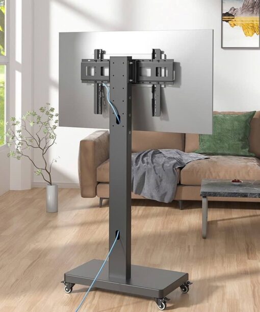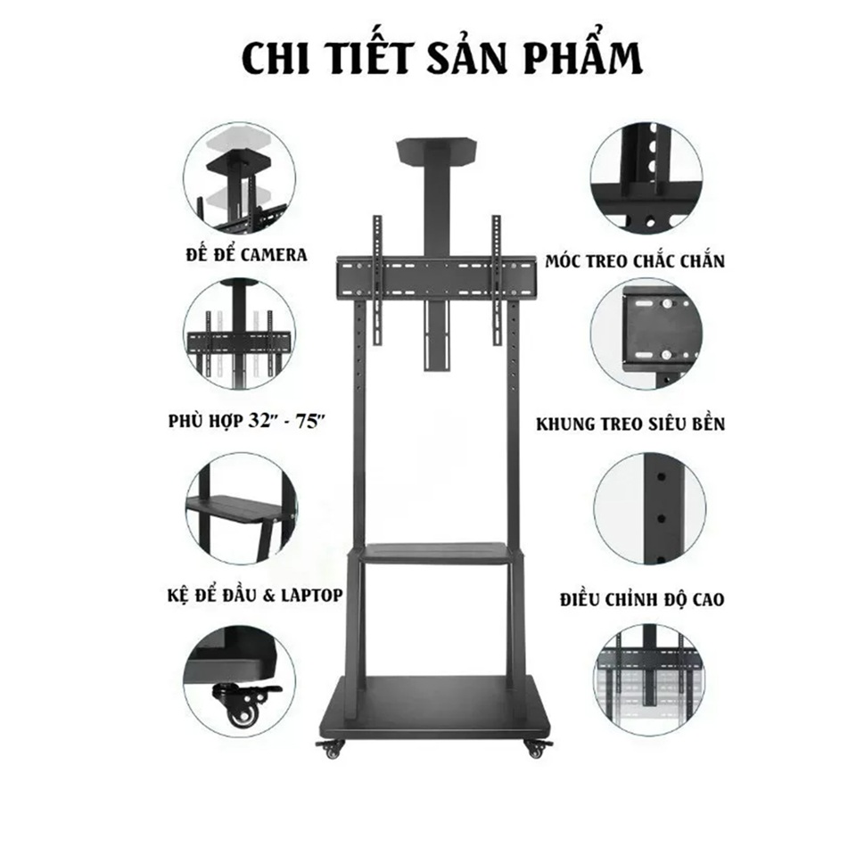 Khung được trang bị 4 bánh xe chịu lực, xoay 360° mượt mà, di chuyển nhẹ nhàng. Mỗi bánh đều có khóa giúp cố định vị trí, hạn chế rung lắc khi TV hoạt động.