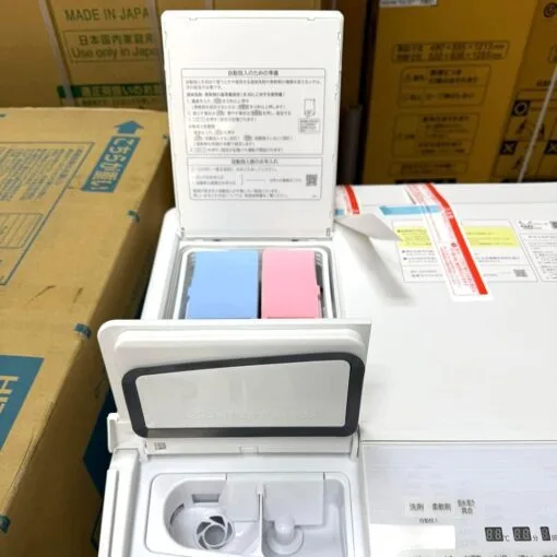 Hai ngăn chứa lớn ở mặt trên của máy giặt có nhiệm vụ chứa chất tẩy rửa (nước giặt, nước xả vải). Cồng nghệ AI sẽ tự tính lượng chất tẩy rửa cần thiết cho mỗi lần giặt, tùy theo chế độ và lượng quần áo và máy cân được.