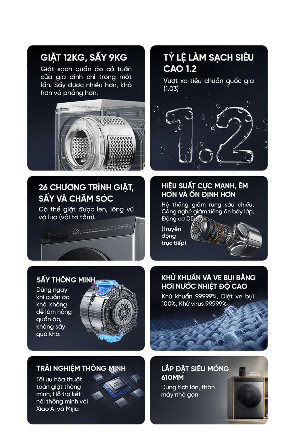 Máy giặt sấy Xiaomi Mijia MJ101 12kg – 9kg là dòng máy giặt cao cấp thế hệ mới của Xiaomi, được thiết kế để đáp ứng nhu cầu giặt giũ của các gia đình hiện đại. Sản phẩm nổi bật với công suất giặt 12kg, sấy 9kg, thiết kế siêu mỏng chỉ 610mm, động cơ truyền động trực tiếp DD và công nghệ khử trùng bằng hơi nước 99.999%, giúp làm sạch sâu, tiết kiệm điện nước và bảo vệ sợi vải tối ưu.