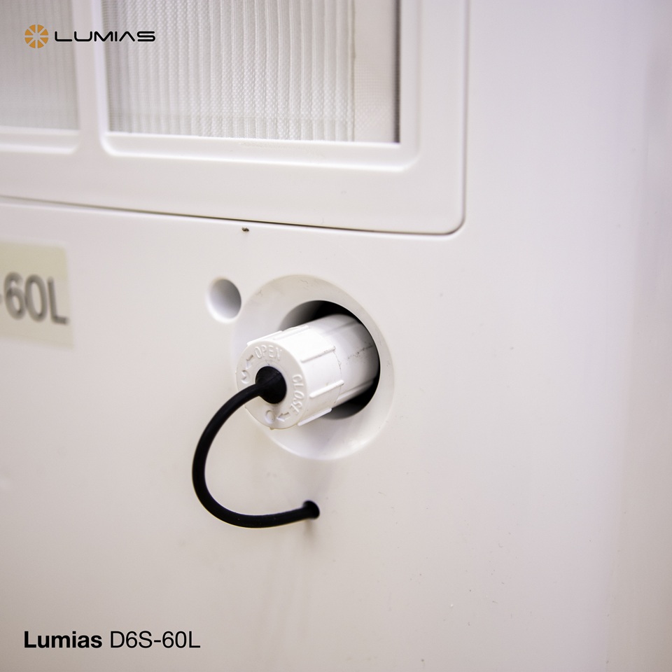 Lumias D6S-60L được trang bị bình chứa nước dung tích 7.7 lít. Bình chứa lớn giúp người dùng không cần đổ nước thường xuyên. Khi bình đầy, hệ thống tự động ngắt và chống tràn thông minh đảm bảo an toàn tuyệt đối. Ngoài ra, Lumias D6S-60L còn hỗ trợ kết nối ống thoát nước liên tục, giúp máy vận hành 24/24 mà không cần giám sát. Tính năng này đặc biệt hữu ích trong mùa nồm ẩm hoặc khi đặt máy tại kho hàng, phòng kín.