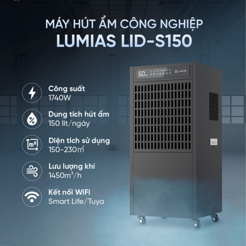 Lumias LID-S150 là mẫu máy hút ẩm công nghiệp cao cấp với công suất hút ẩm 150 lít/ngày. Thiết bị được thiết kế cho không gian lớn từ 150 – 230m², phù hợp cho kho hàng, nhà xưởng, phòng máy, kho nguyên liệu và khu vực sản xuất yêu cầu kiểm soát ẩm nghiêm ngặt. Máy vận hành mạnh mẽ nhưng ổn định, mang lại hiệu quả rõ rệt trong cả môi trường ẩm nặng.