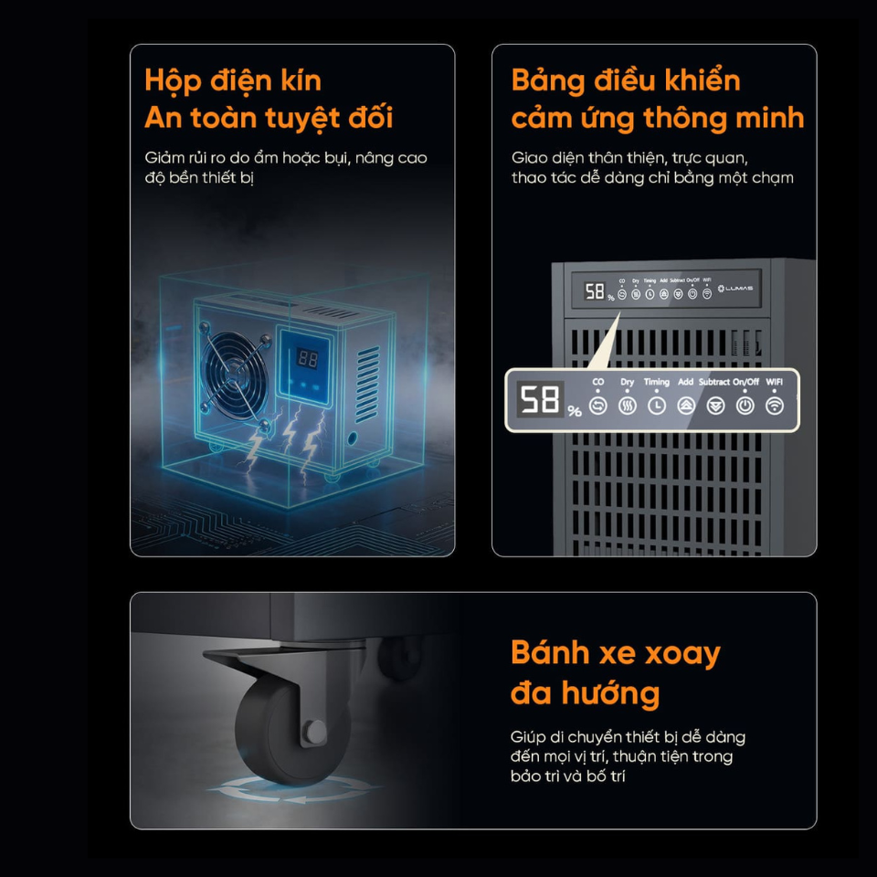 Thiết bị giúp giảm ẩm nhanh, hạn chế nấm mốc, bụi ẩm và ngưng tụ nước trên bề mặt.