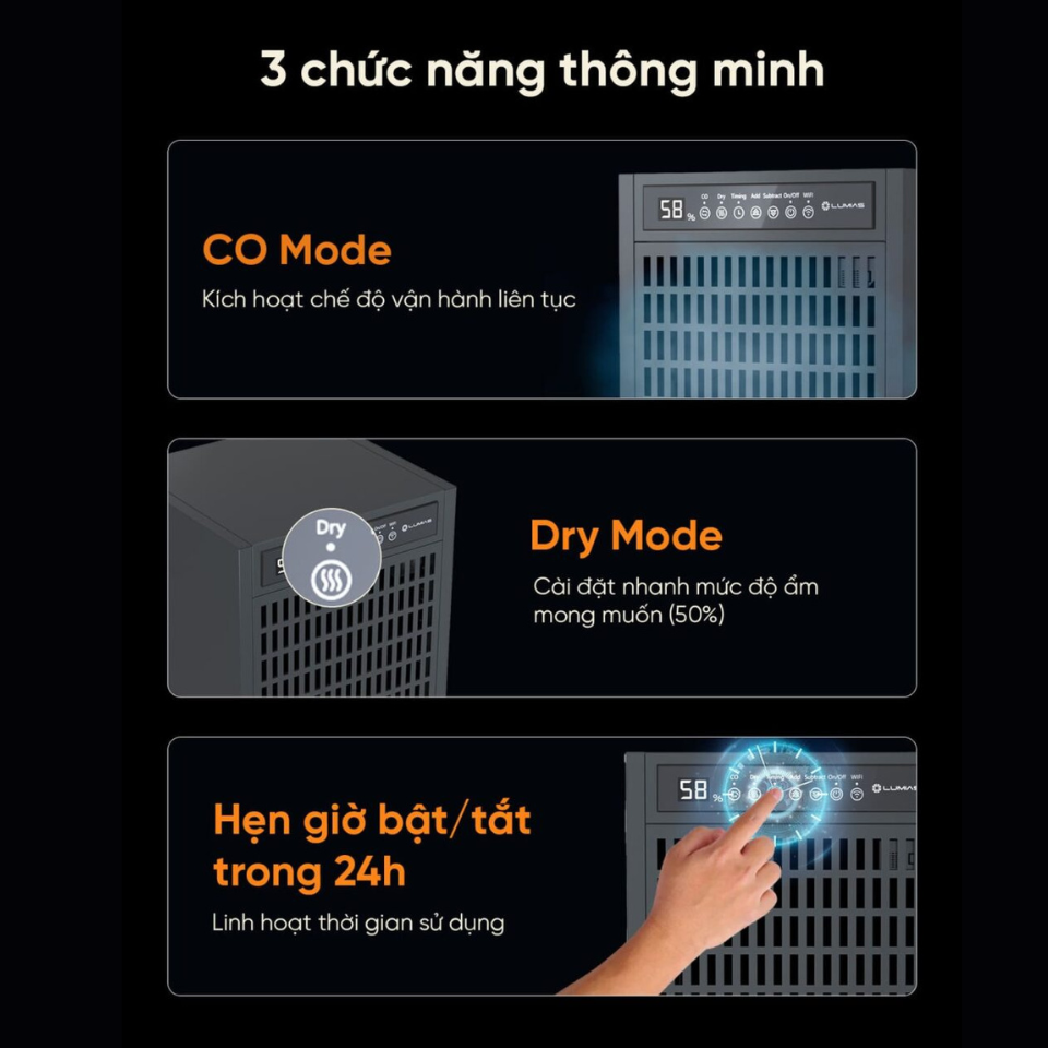 CO – Chạy liên tục để hút ẩm mạnh.