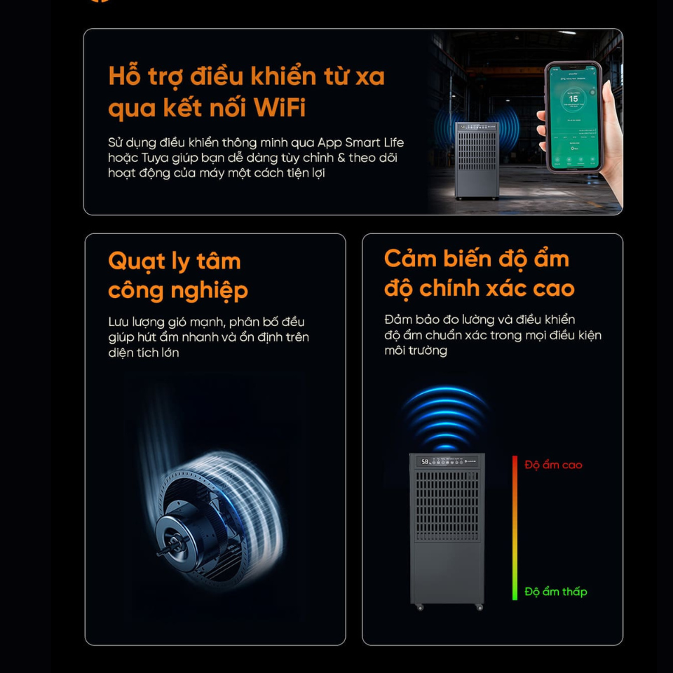 Thiết bị giúp giảm ẩm nhanh, ngăn nấm mốc và bảo vệ hàng hóa trước môi trường ẩm kéo dài.