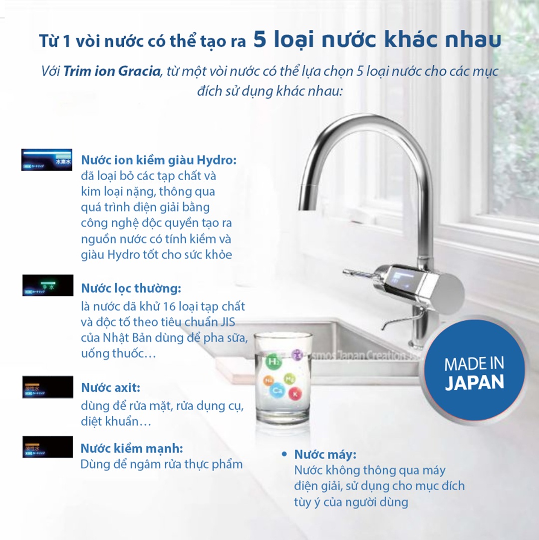 Trim Ion Gracia cung cấp 5 loại nước với dải pH từ 3.5 đến 10.5, đáp ứng nhu cầu sử dụng hàng ngày cho cả gia đình.