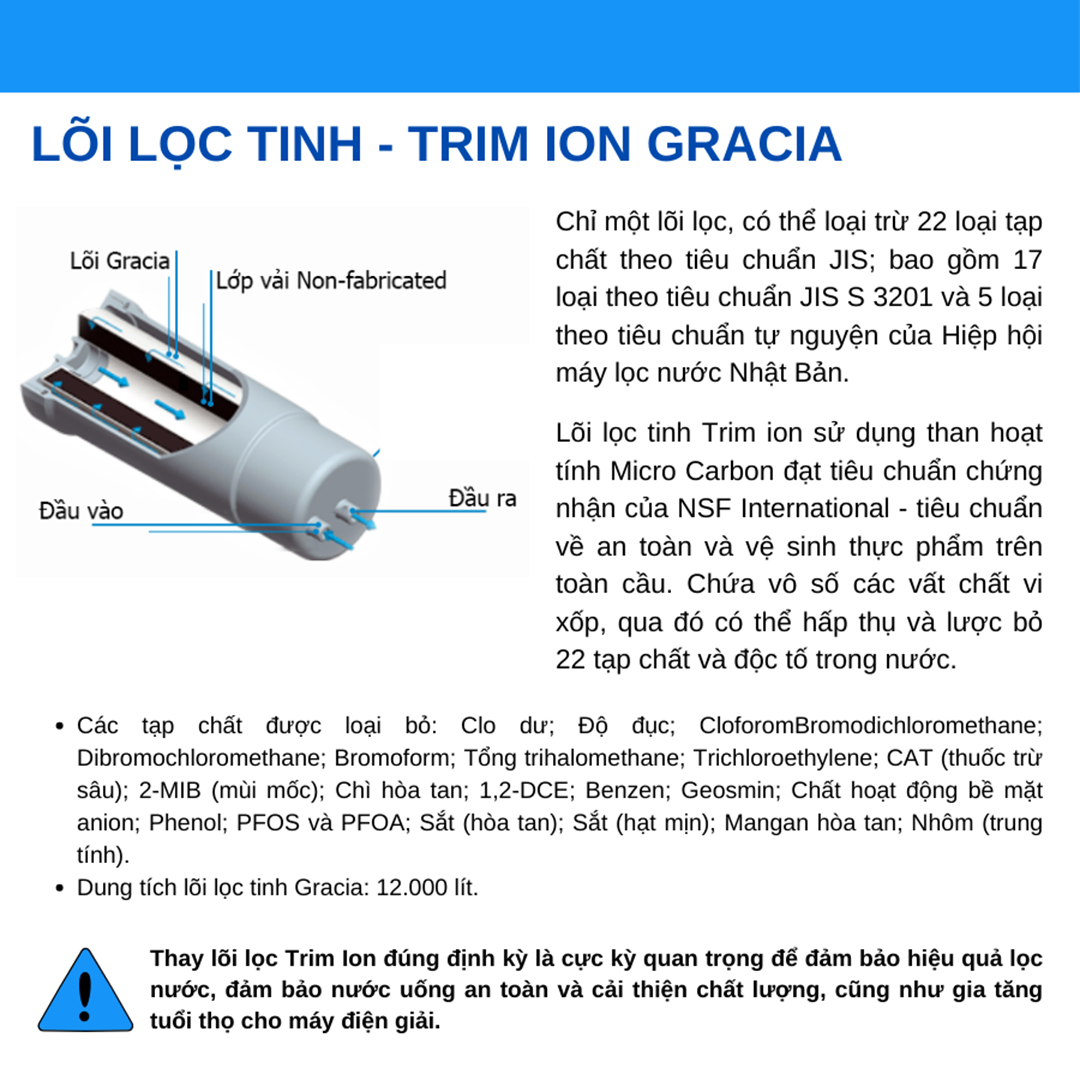 Máy lọc nước ion kiềm Trim Ion Gracia được trang bị lõi lọc tinh cao cấp, đảm bảo nước đầu ra đạt tiêu chuẩn JIS (Nhật Bản). Lõi lọc có khả năng loại bỏ đến 16 chất độc hại theo quy chuẩn Nhật Bản bao gồm: clo dư, chì, thuốc trừ sâu, kim loại nặng và các chất ô nhiễm hữu cơ. Ngoài ra, vi khuẩn, virus, vi sinh vật gây hại cũng bị loại bỏ gần như hoàn toàn nhờ công nghệ lọc đa tầng hiện đại.