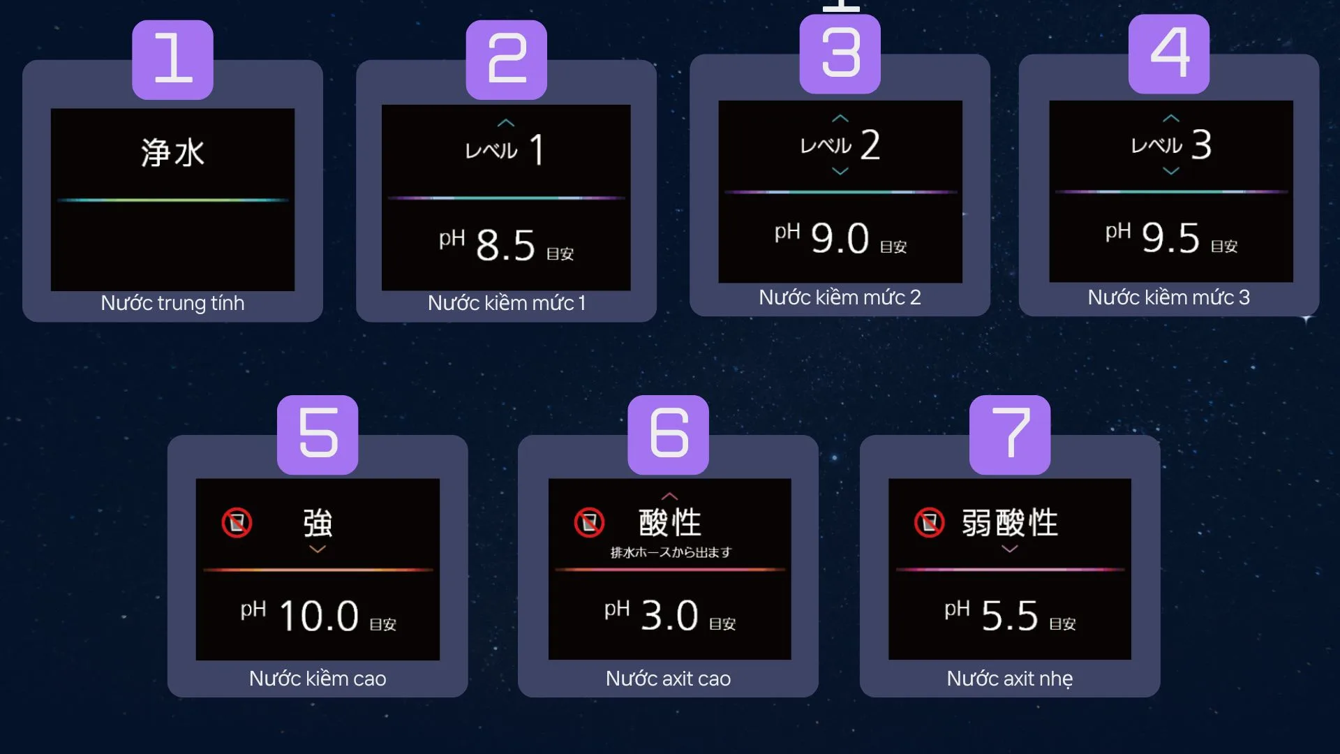 Panasonic TK-HS71 nổi bật với khả năng tạo ra 7 loại nước với độ pH linh hoạt, bao gồm: