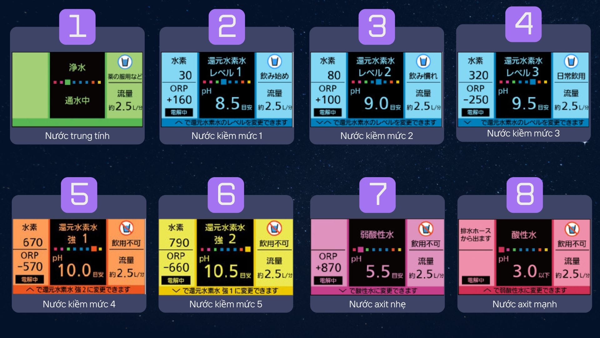 Gồm 4 mức nước kiềm (pH ~8.5–10.5), 2 mức axit nhẹ (pH ~5.5), nước tinh khiết và nước trung tính. - ✅ 7 tấm điện cực hiệu suất cao