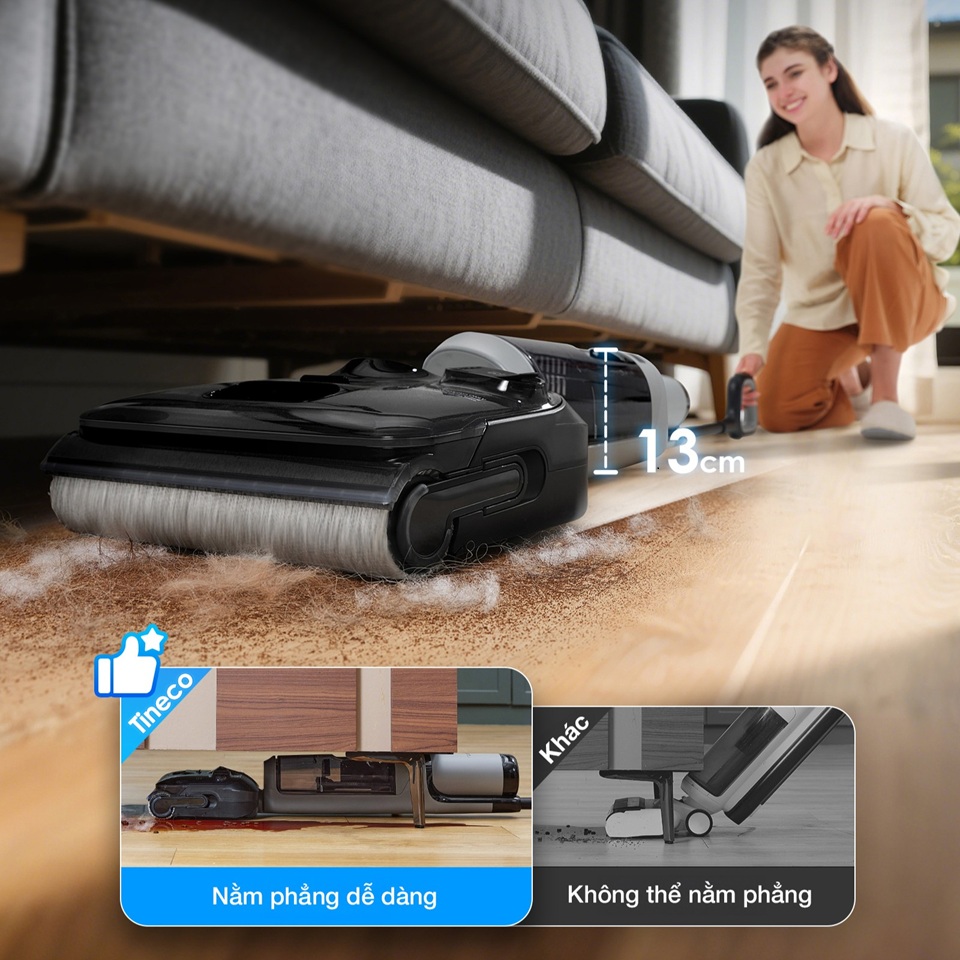 Tineco i5 Stretch Plus có thiết kế HyperStretch cho phép máy nằm phẳng đến 180 độ. Giúp dễ dàng lau dọn dưới gầm giường, tủ, sofa và những nơi có độ cao thấp chỉ 5–10 cm.