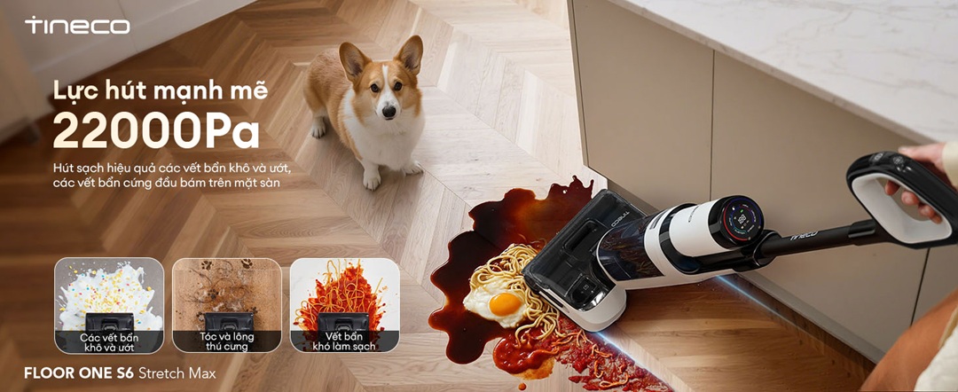 Tineco Floor One S6 Stretch Max sở hữu lực hút 22.000Pa mạnh mẽ top đầu phân khúc.
