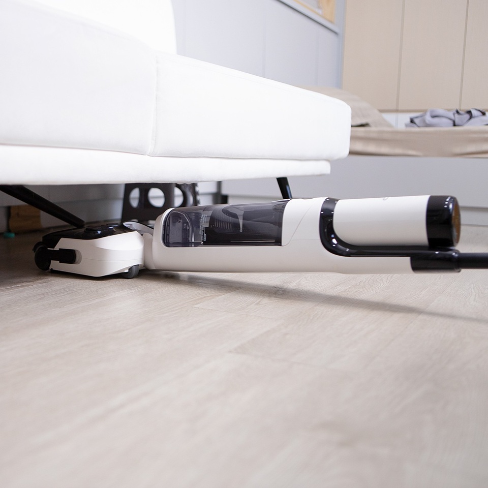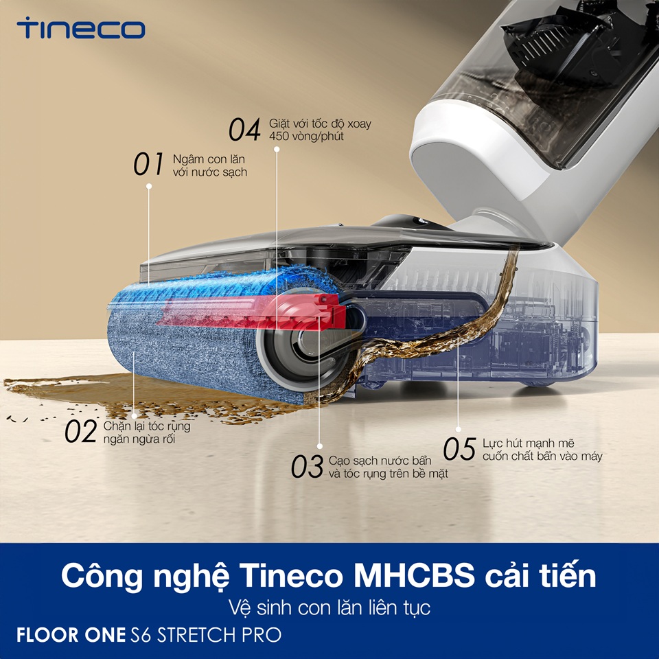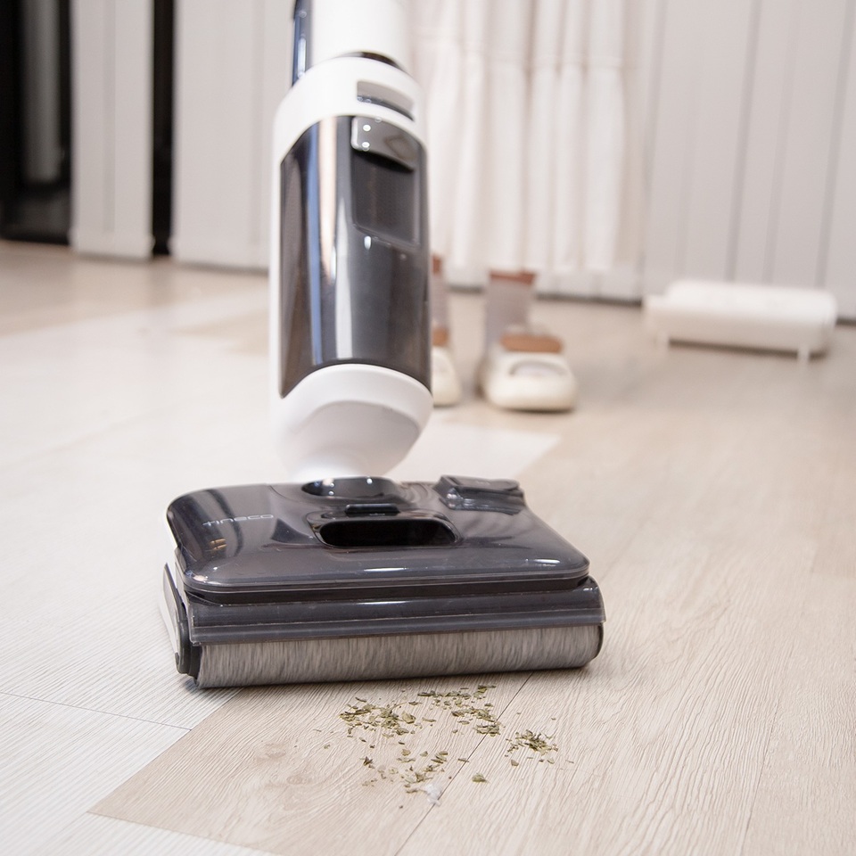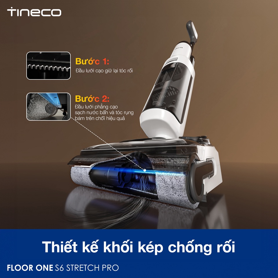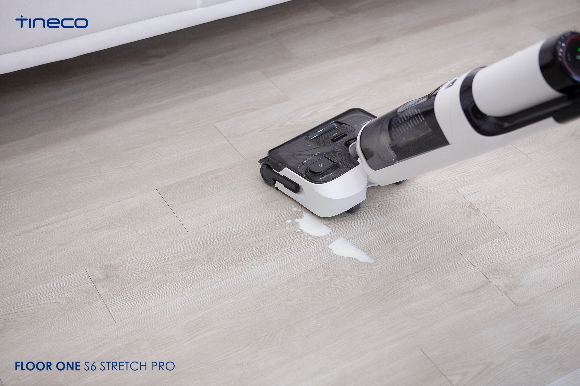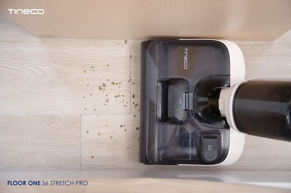Tineco S6 Stretch Pro hỗ trợ làm sạch ướt và khô cùng lúc. Hệ thống chổi lăn cùng lực hút mạnh giúp loại bỏ bụi mịn, lông thú, vụn thức ăn và các vết bẩn bám trên sàn. Nhờ vậy, bạn không cần phải quét trước rồi mới lau sau như cách truyền thống.