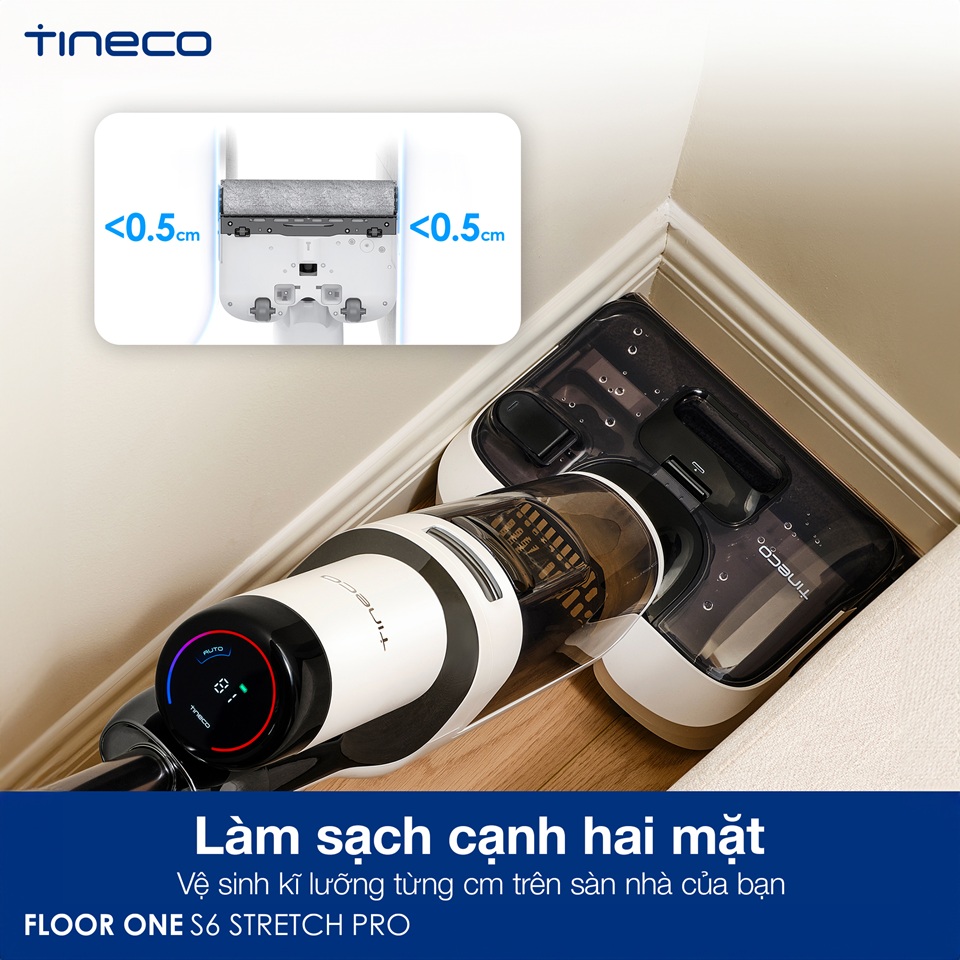 Tineco S6 Stretch Pro được thiết kế với đầu hút hai bên sát mép tường. Giúp máy có thể làm sạch hiệu quả mọi góc cạnh, chân tường mà nhiều mẫu máy khác thường bỏ sót.