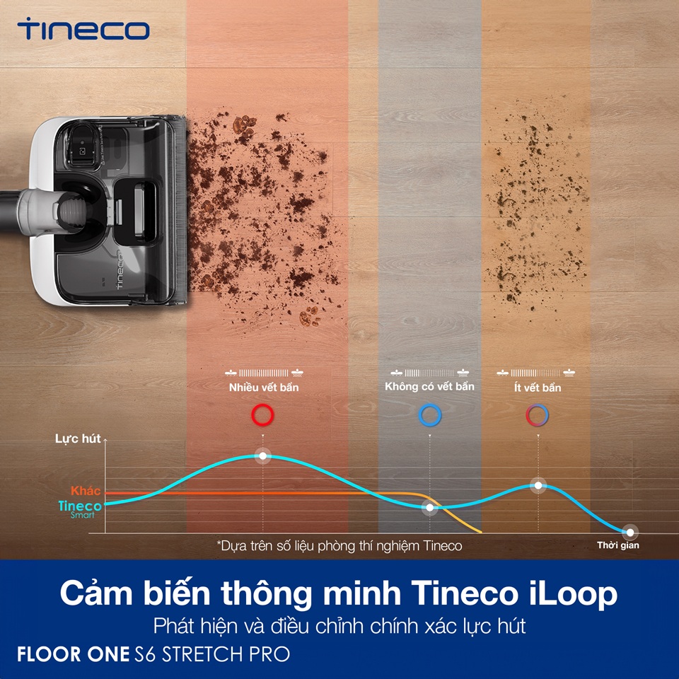 Tineco S6 Pro được trang bị cảm biến iLoop thế hệ mới. Cảm biến này phát hiện chính xác mức độ bụi bẩn trên sàn theo thời gian thực. Dựa trên đó, máy sẽ tự điều chỉnh lực hút, lượng nước và tốc độ chổi lăn cho phù hợp. Nhờ vậy, máy làm sạch hiệu quả hơn, tiết kiệm pin và giảm tiếng ồn. Vòng LED đổi màu trực quan giúp người dùng theo dõi tình trạng làm sạch ngay trên thân máy.