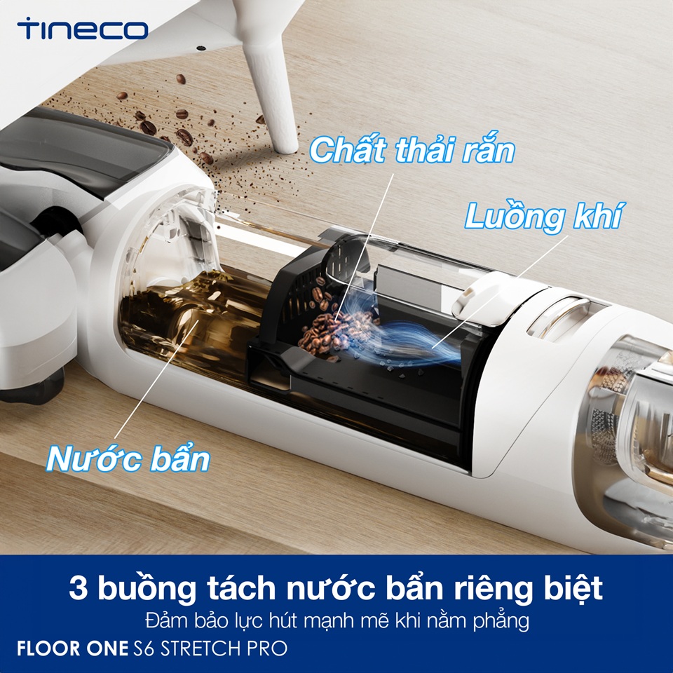Tineco S6 Pro được thiết kế với 3 buồng riêng biệt: nước sạch, nước bẩn và rác khô. Nước sạch luôn được giữ riêng, không bị trộn lẫn trong quá trình sử dụng. Nước dơ và rác được thu gom vào ngăn riêng, dễ tháo lắp và vệ sinh. Thiết kế này giúp máy luôn hoạt động sạch sẽ, đảm bảo hiệu quả lau hút và ngăn mùi hôi sau mỗi lần dùng.