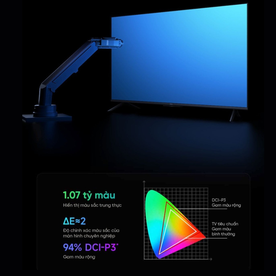 Công nghệ DCI-P3 94% giúp mở rộng dải màu, hiển thị tới 1,07 tỷ màu rực rỡ và chính xác. Ở chế độ hiệu năng cao, tivi có thể hỗ trợ tần số quét lên tới 144Hz. Bên cạnh đó, công nghệ MEMC 120Hz giúp bù chuyển động thông minh, giảm hiện tượng nhòe hoặc mờ khi xem các cảnh tốc độ cao. Góc nhìn rộng 178° giúp nhìn rõ nét ở mọi vị trí.