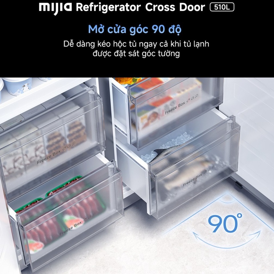 Tủ lạnh Xiaomi Mijia Cross Door 510L được thiết kế cửa mở 90° thông minh. Giúp lắp đặt linh hoạt trong mọi không gian mà không lo vướng góc tường hay đồ nội thất xung quanh. Ngay cả khi cửa chỉ mở tối đa 90 độ, các ngăn kéo bên trong vẫn có thể trượt ra vào dễ dàng. Điều đó cho phép người dùng lấy hoặc cất thực phẩm thuận tiện mà không cần mở toàn bộ cánh tủ. Thiết kế này giúp tiết kiệm diện tích lắp đặt, phù hợp cho căn bếp nhỏ