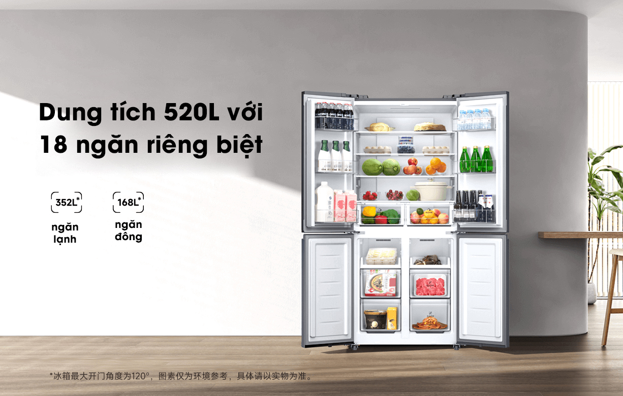 Dung tích 520L thoải mái lưu trữ cho gia đình 4–6 người.