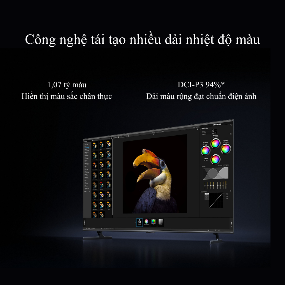 Tivi hỗ trợ nhiều mức nhiệt độ màu và ba dải màu khác nhau, mang đến hình ảnh cân bằng và tự nhiên. Công nghệ Local Dimming thông minh điều chỉnh nhiệt độ màu theo độ sáng môi trường. Nhờ đó, màu sắc chính xác trong mọi điều kiện, từ phòng tối đến nơi có ánh sáng mạnh.
