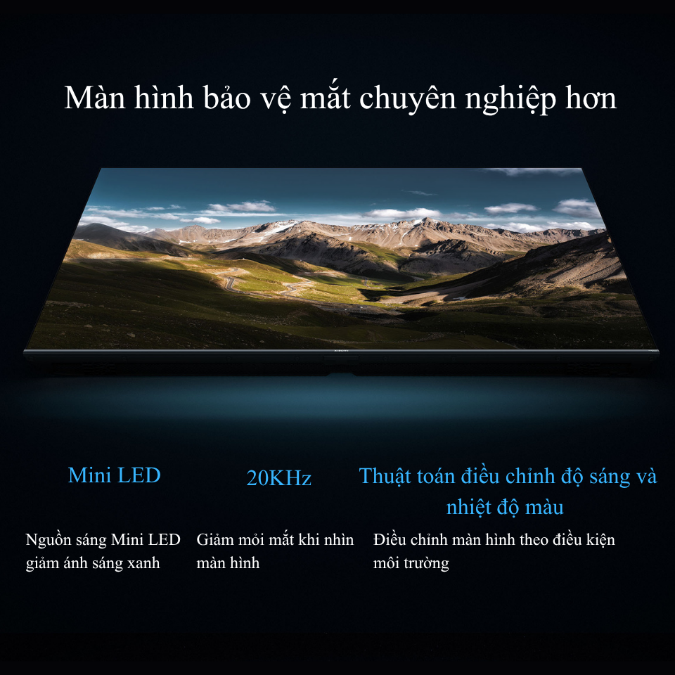 Tivi được trang bị cảm biến ánh sáng và cảm biến nhiệt màu, tự động điều chỉnh hiển thị. Công nghệ giảm ánh sáng xanh và khử nhấp nháy tần số cao giúp hạn chế mỏi mắt. Đây là lựa chọn an toàn cho gia đình có trẻ nhỏ hoặc người thường xuyên xem tivi nhiều giờ.
