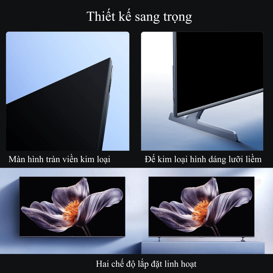 Màn hình tràn viền với tỷ lệ hiển thị đạt 98% giúp hình ảnh rộng mở và ấn tượng hơn. Tivi được hoàn thiện bằng khung kim loại chắc chắn, đế dáng lưỡi kiếm sang trọng và vững chãi. Chân đế hỗ trợ hai chế độ lắp đặt, phù hợp cả phòng khách rộng hay phòng nhỏ gọn.