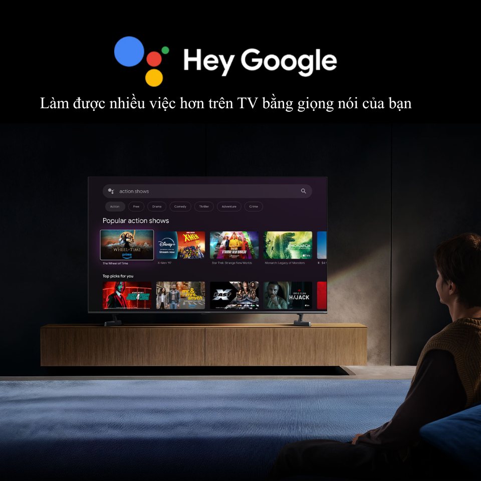 Tivi tích hợp Google Assistant, cho phép mở ứng dụng, phát nhạc, tìm phim và điều khiển thiết bị thông minh bằng giọng nói. Chỉ cần nhấn nút Google Assistant trên điều khiển để bắt đầu.